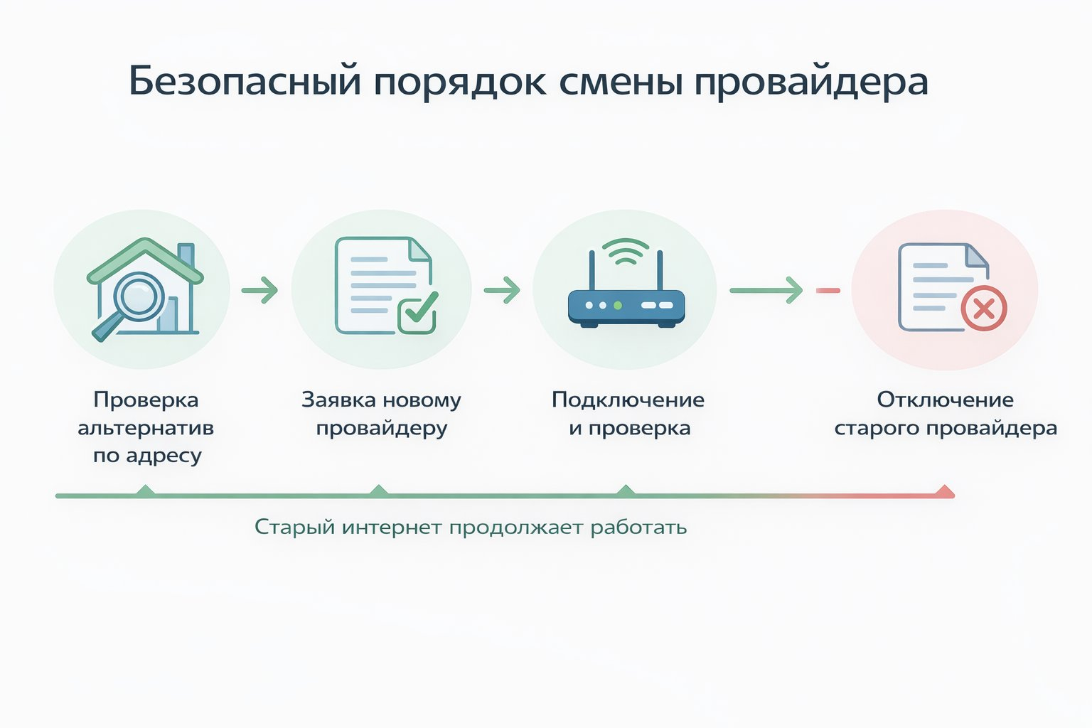 Смена провайдера должна начинаться не с расторжения старого договора, а с проверки альтернатив по точному адресу, условий нового подключения и статуса оборудования у текущего оператора. Правильный порядок почти всегда такой: проверить доступность, выбрать нового провайдера, дождаться подключения и только потом корректно закрывать старый договор.