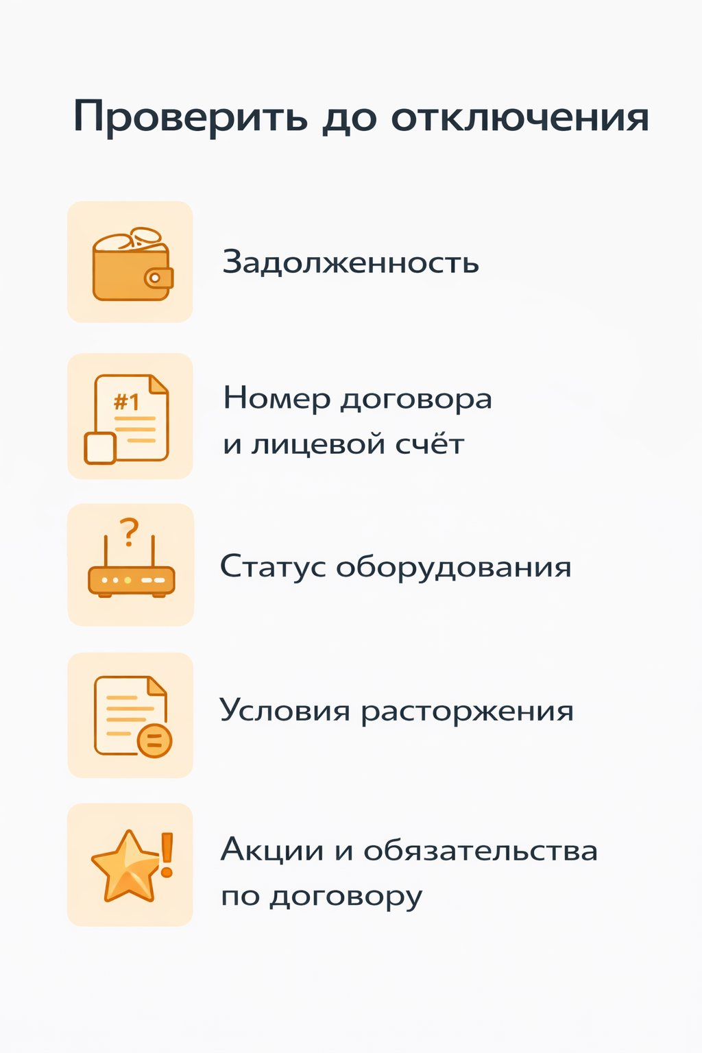 Номер договора и лицевой счет лучше найти заранее, чтобы не искать их уже в момент отказа от услуг. Если номер под рукой не сохранился, помогут способы узнать номер договора интернет-провайдера. А по условиям отключения и оборудования стоит помнить простую вещь: у провайдеров вопросы расторжения, переноса услуг, возврата техники и расчетов обычно оформляются как отдельные процедуры, поэтому перед отключением полезно заранее проверить не только сам порядок отказа от услуг, но и все связанные условия по оборудованию.